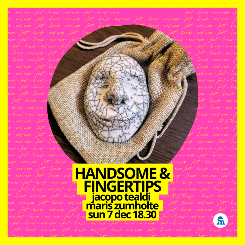 Handsome & fingertips is an evolution of Jacopo Tealdi’s manual theatre, and in this show he explores the meaning of life through puppet theatre and micro-theatre. We see a human being at a table, performing ritualistic movements: from a small jute bag in the palm of his hand, the story of a tiny ceramic mask comes to life. Without the need for words, only through the movement of his hand, which becomes the body of the mask, Jacopo tells the story of how we become aware of ourselves and the world. A deeply enchanting and moving show, with the power of a dream capable of narrating existence. With soundscapes and live music composed by multi-instrumentalist Maris Zumholte, pianist, beatboxer and sound effects artist. The actor’s attention, care and presence allow beauty, enchantment and wonder to manifest themselves with simplicity.